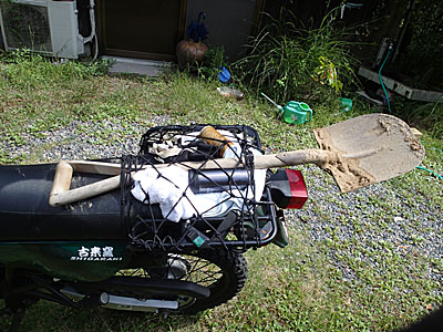 さて、このスズキ君が先日違った形で働いてくれました。記憶に新しいことですが、台風18号の被害が信楽では結構大きかったのです。道路が壊れたり、床上床下浸水したり、信楽高原鉄道の鉄橋が流されたり。そして、知り合いの住んでいる地域では、山の土砂が大量に流れてきたのです。町内会長会議の時に復旧作業の応援要請があり(今年と来年は町内会長さんなのです)、スコップ片手に作業に行ってきました。この時、スズキ君が活躍。クルマだと置いておく場所が無いのが想像出来たけど、スズキ君なら大丈夫。スコップをくくりつけて行ってきました。